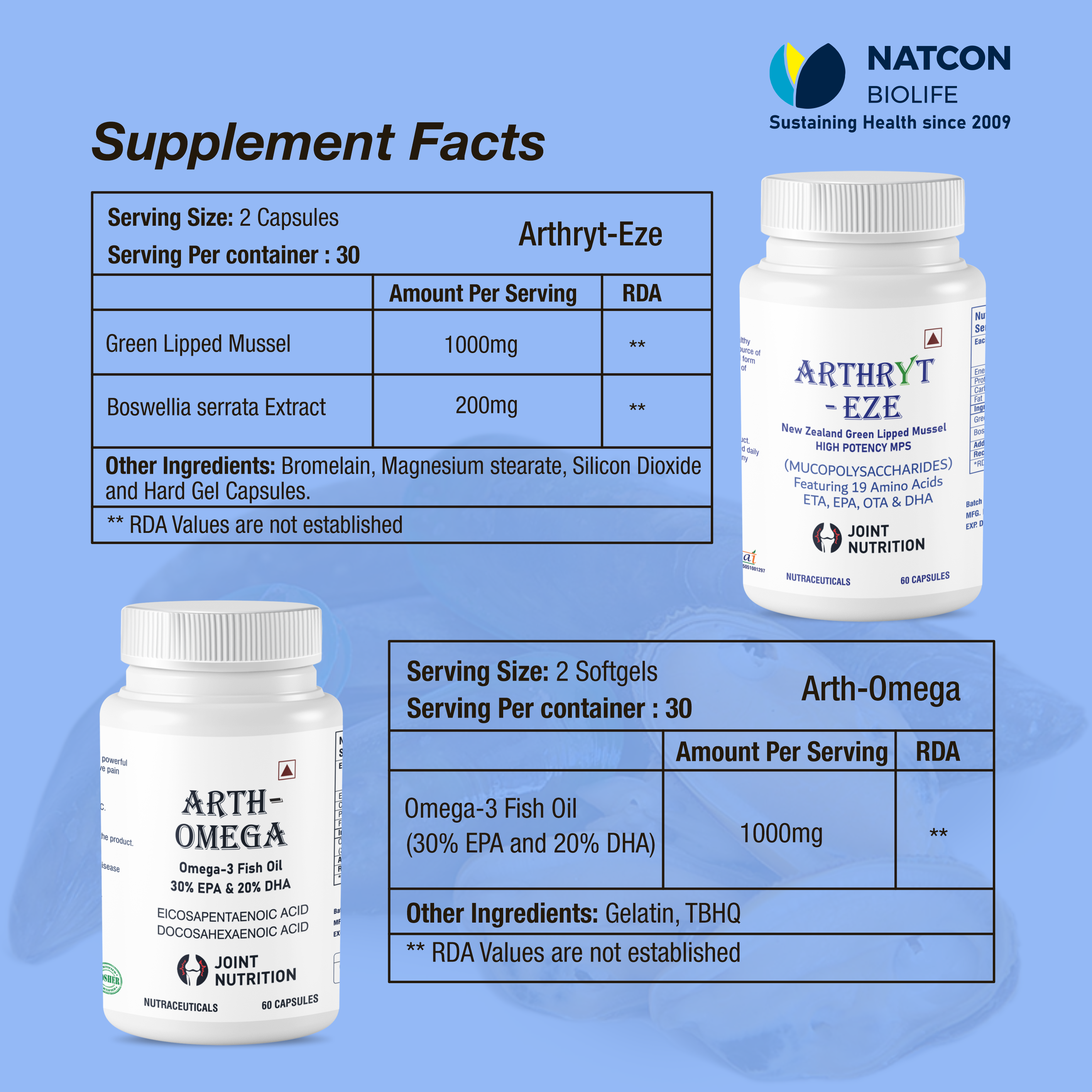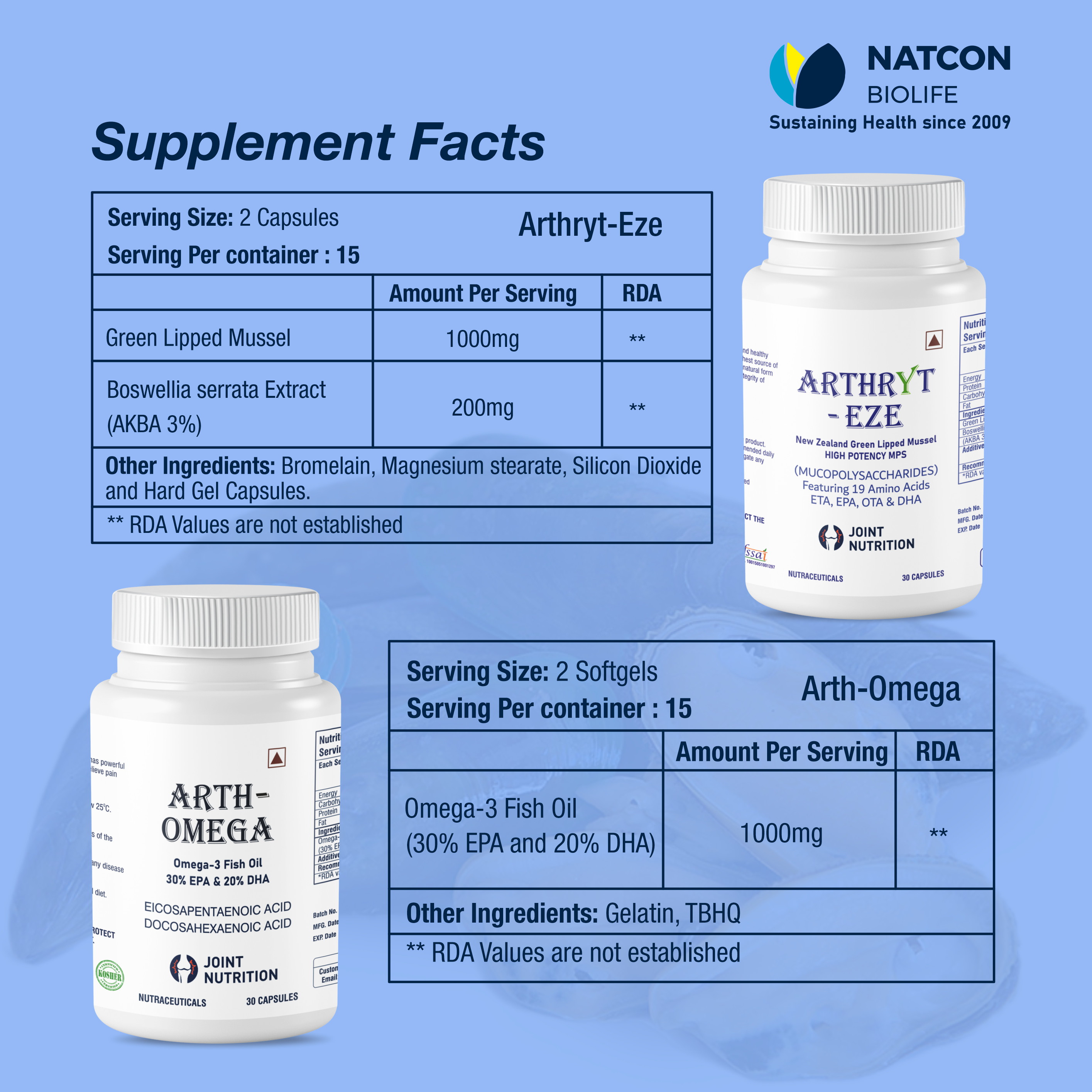 Arthryt Eze has been shown to help support joint pain relief in as little as 2-5 days and provide effective long-term pain management when used consistently. The unique combination of Green Lipped Mussel, Bromelain, Boswellia Extracts, 19 Amino Acids, and high-potency Omega 3 Fish Oil helps with immediate control of joint pain and provides long-term support for bone and joint health.*