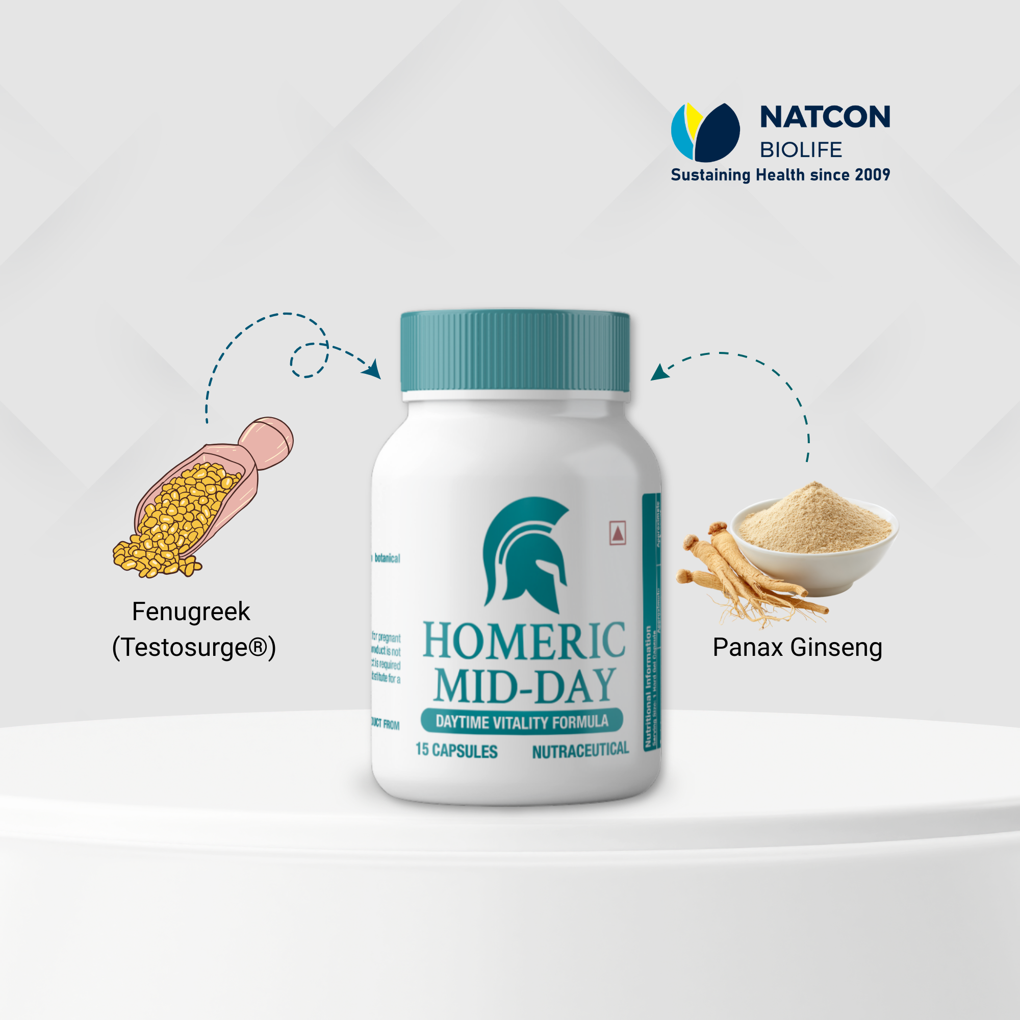 The midday component combines Testosurge® (a standardized fenugreek extract) with Panax ginseng. These two ingredients are known for their supportive role in male hormones and physical vitality.