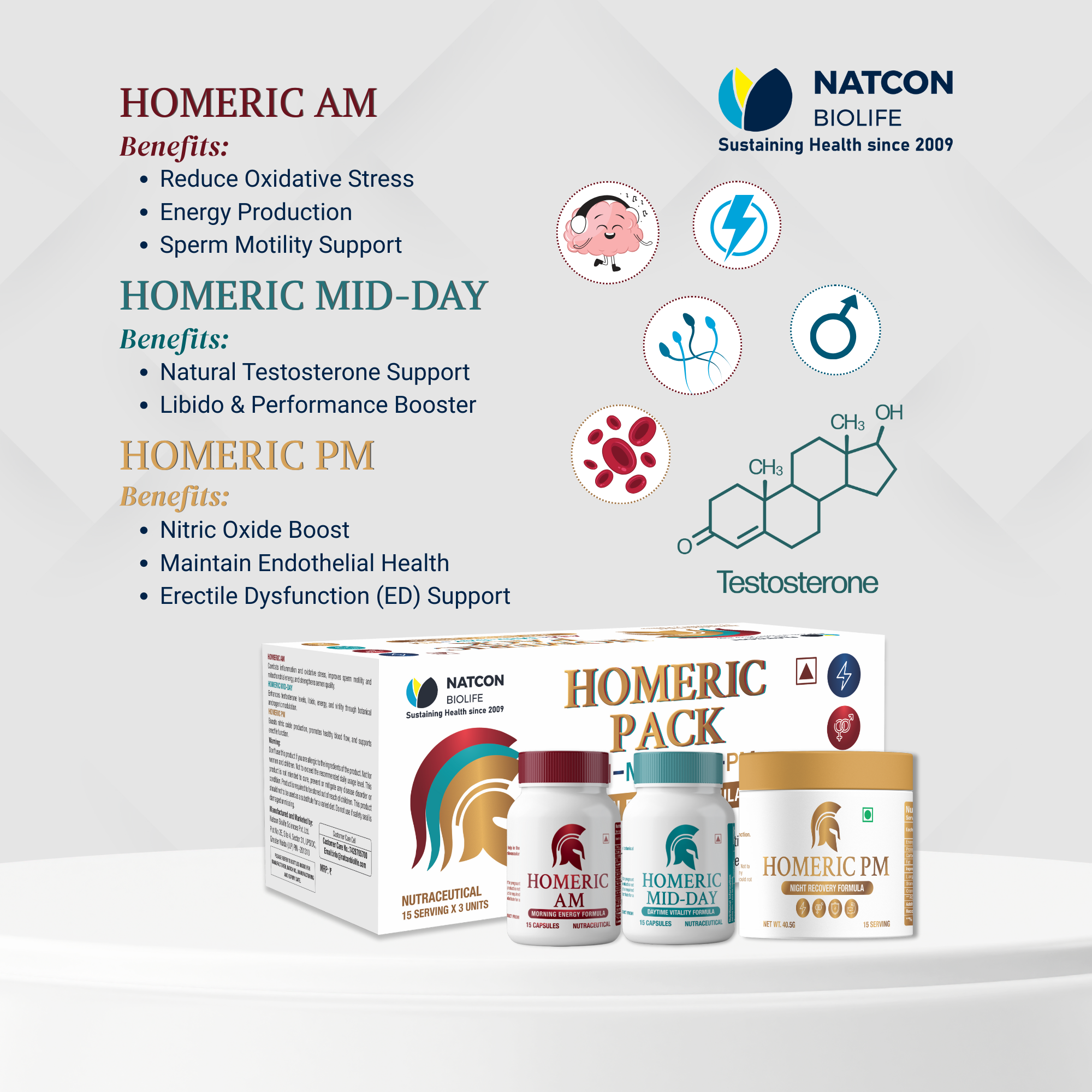 The Homeric Pack is a 3-step daily nutraceutical regimen scientifically designed for men’s performance, fertility, and vitality. The formulation targets the major physiological factors involved in male reproductive health — oxidative stress, hormonal imbalance, and vascular function — through synergistic ingredient combinations.